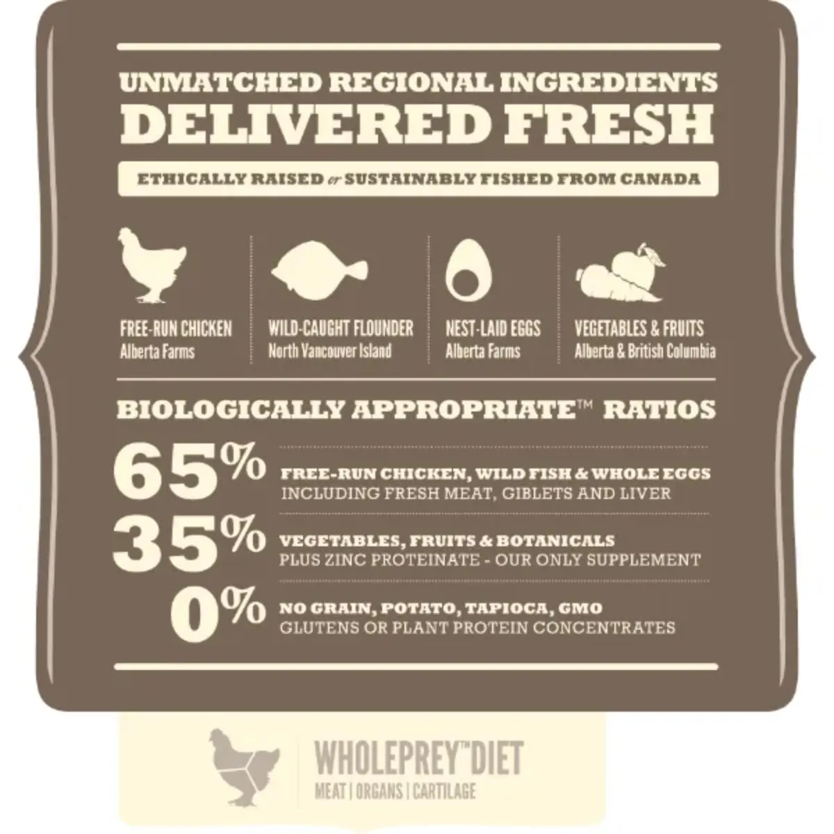 65% di Ingredienti Animali di Alta Qualità: Composto da pollo allevato all’aperto, uova deposte in nido e pesce piatto pescato in natura.