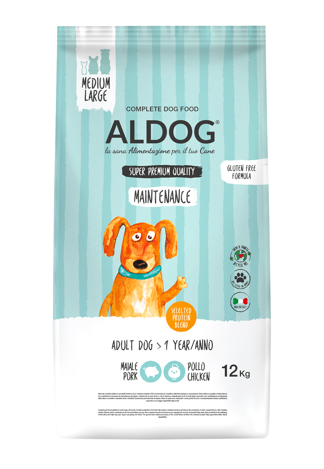 Aldog Super premium Adult All Breeds Maintenance è l’alimento completo adatto a cani adulti di tutte le razze. Crocchette multi proteiche ricche di maiale, manzo e pollo. Crocchette per cani che favoriscono all’equilibrio della flora batterica e la produzione di feci solide e compatte.