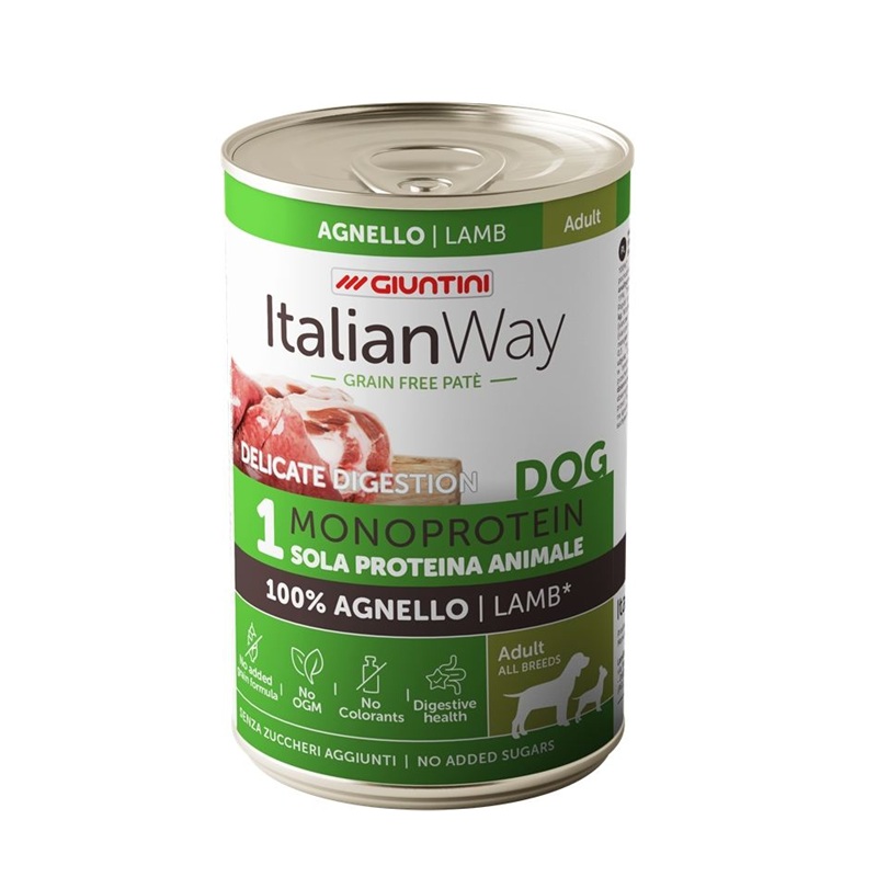 L’umido Italian Way Paté Adult con Agnello offre al tuo cane un pasto gourmet che non scende a compromessi con la salute. Grazie alla consistenza morbida e invitante del paté, questa lattina da 400 gr è perfetta sia come pasto unico che come appetizzante miscelato alle crocchette.