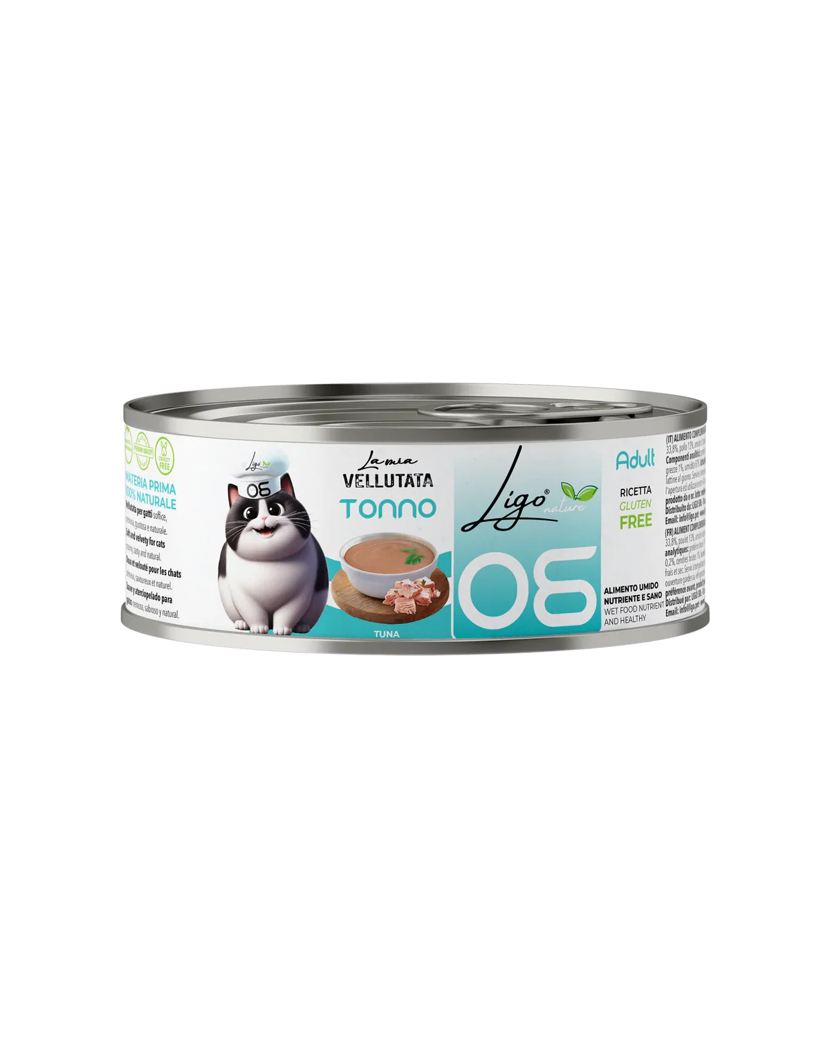 Ligo Vellutata N06 Tonno è una raffinata mousse dedicata ai gatti che adorano il sapore intenso e naturale del pesce. Questa ricetta è composta esclusivamente da tonno di prima scelta, selezionato e frullato finemente fino a raggiungere una consistenza cremosa, soffice e priva di grumi, perfetta per essere gustata agevolmente anche dai gatti più esigenti.