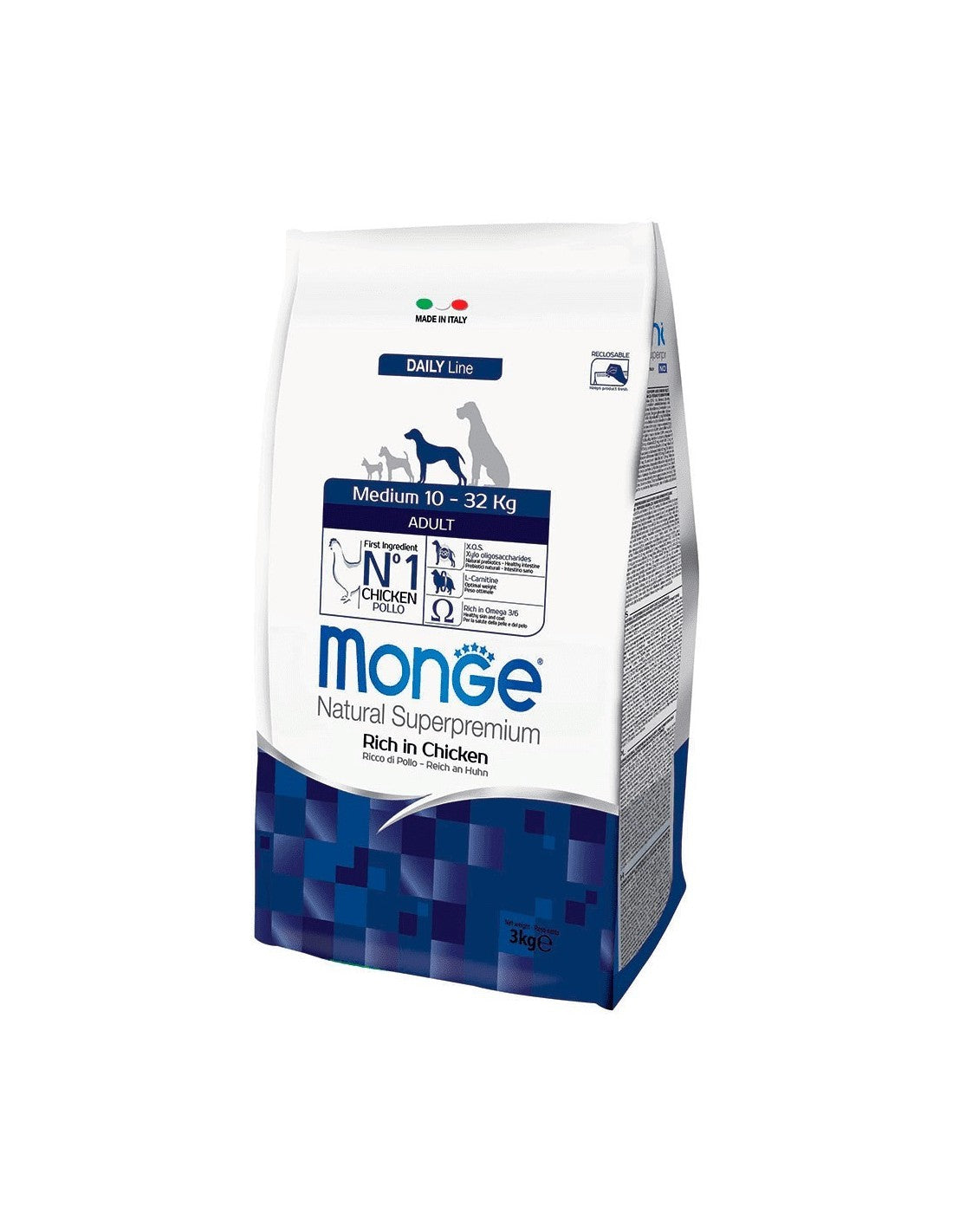 Pollo (fresco 10%, disidratato 30%), riso, granturco, grasso animale (olio di pollo contenuto in grassi 99,5%, conservato con antiossidanti naturali), polpa di barbabietola, lievito di birra (fonte di M.O.S. e vitamina B12), glutine di granturco, proteine animali idrolizzate, pesce (salmone disidratato), olio di pesce (olio di salmone), cartilagine idrolizzata (fonte di condroitina solfato), crostacei idrolizzati (fonte di glucosamina), metil sulfonil metano, X.O.S. (Xylo – oligosaccaridi 3 g/kg), idrolizzato di lievito (M.O.S.), yucca schidigera, spirulina.