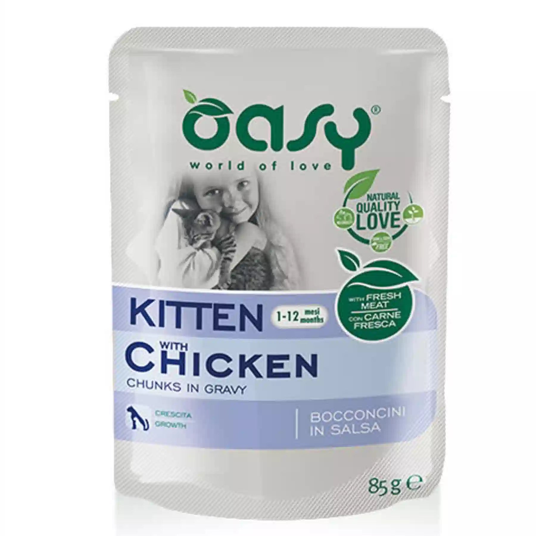 Il cibo umido per gattini Oasy è un delizioso alimento composto da bocconcini di pollo di qualità accompagnata da una squisita salsa ricca di gusto.
