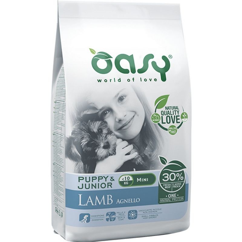 Le crocchette per cani Oasy One Animal Protein Puppy & Junior Small/Mini Agnello sono l’ideale per i cuccioli di taglia mini e small con intolleranze alimentari, sensibilità intestinale e cutanea.