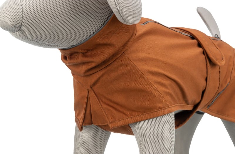 Il design è estremamente funzionale: è dotato di due cerniere impermeabili sul dorso, ideali per chi utilizza la pettorina o il collare, consentendo di agganciare il guinzaglio senza far entrare l’acqua. La tonalità ruggine non è solo esteticamente ricercata, ma garantisce anche una buona visibilità in contesti naturali e urbani, completata da sottili dettagli riflettenti.